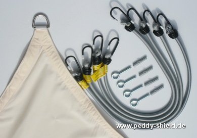 Toldo de sol / vela rectangular 3x4 m – impregnado contra agua – con anillos metálicos de acero inox en cada canto - con 4x tensores elásticos (70 cm – 100 cm) - 4x tornillos con anillos de acero inox – en mala transparente.