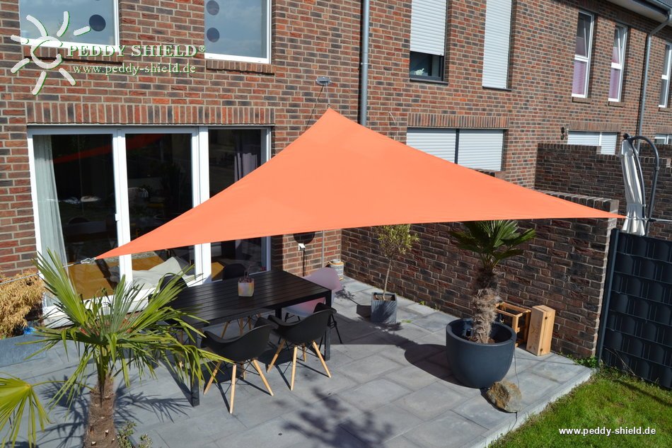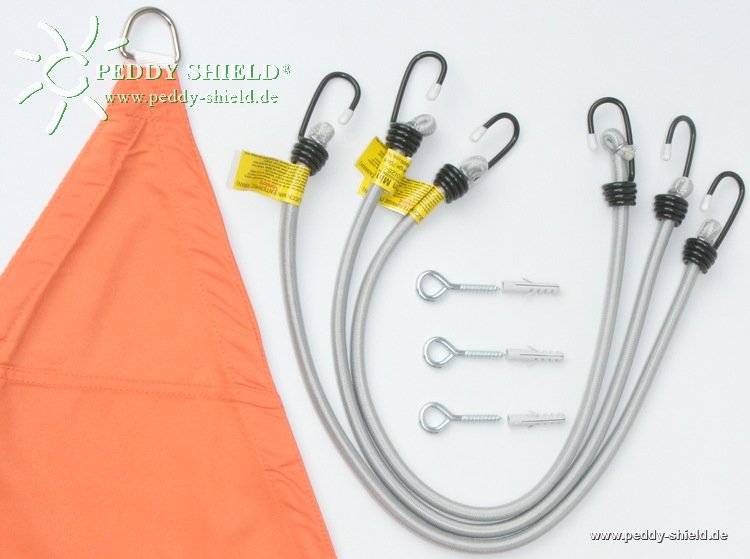Toldo de sol / vela triangular 360x360x360 cm – impregnado contra agua – con anillos metálicos de acero inox en cada canto - con 3x tensores elásticos (70 cm – 100 cm) - 3x tornillos con anillos de acero inox – en mala transparente